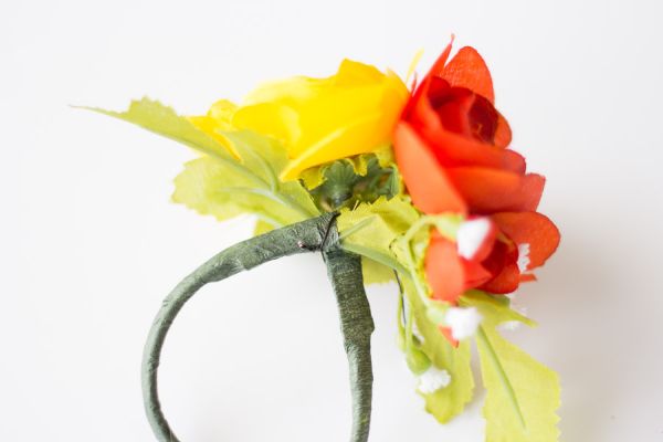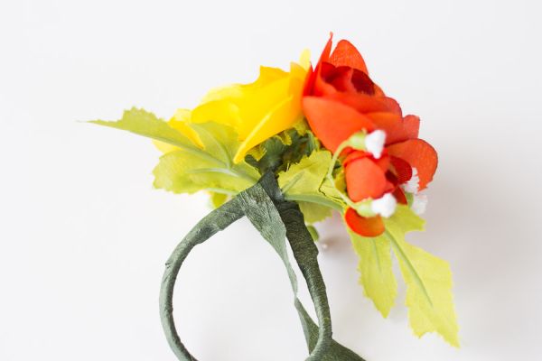 Agora, mantenha as duas flores unidas utilizando um pedaço de arame fino maleável.