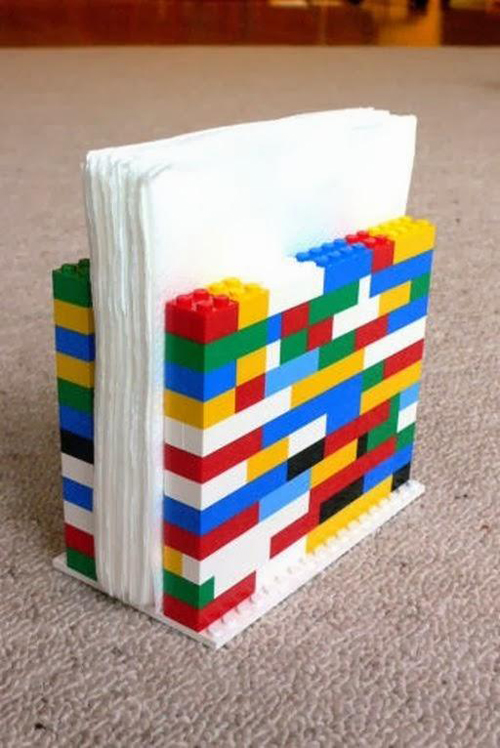 Se o tema da sua festinha de aniversário infantil for Lego, por exemplo, você pode criar um colorido porta guardanapo com as pecinhas do Lego. Este modelo é fácil de ser feito e você pode usar as pecinhas que você já possua em casa. Para não estourar orçamento, faça este modelo de porta guardanapo apenas para a mesa dos alimentos e não para todas as mesas dos convidados.
