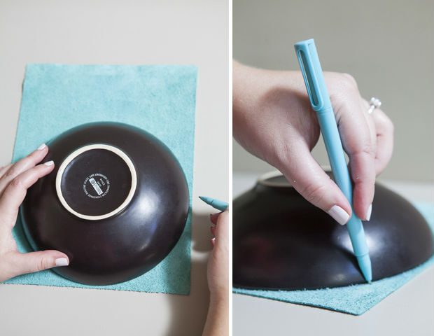 Primeiro, utilize uma tigela para fazer o molde do seu porta joias sobre o couro.