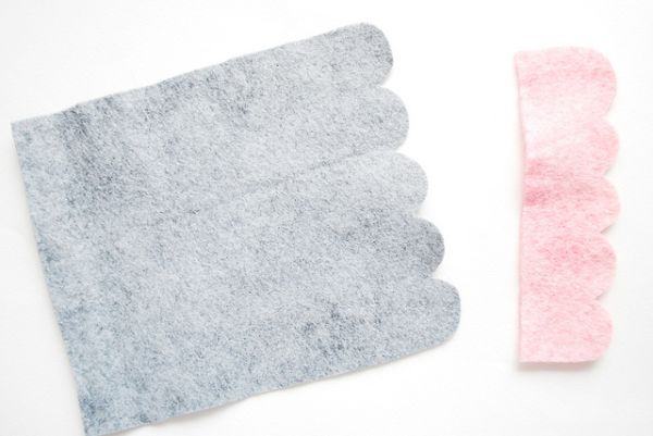 Em seguida, corte duas peças nos feltros, com uma parte em cada feltro de sua preferência. Sendo que uma parte deverá ser uma tira, mas com uma das laterais sendo cortadas com “curvinhas” e a outra parte sendo um quadrado, e também com uma das partes com “curvinhas”.