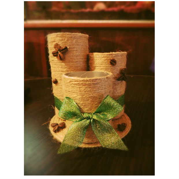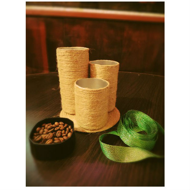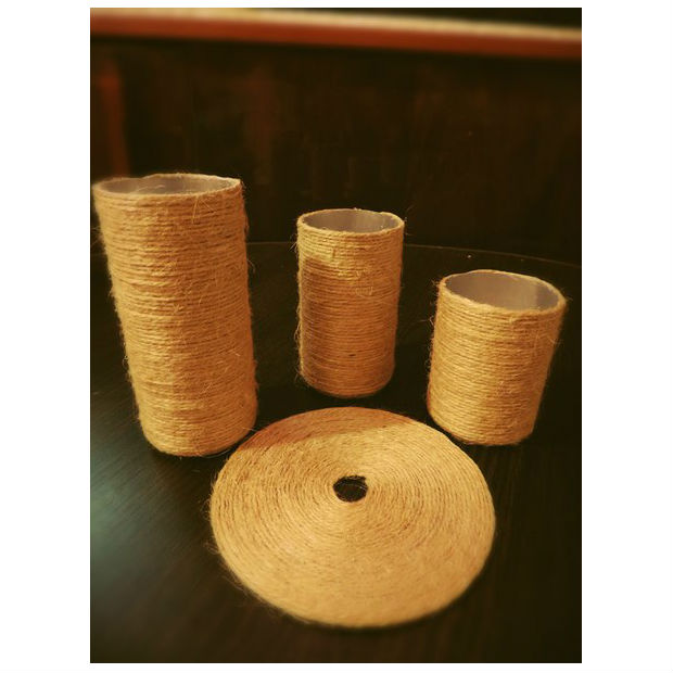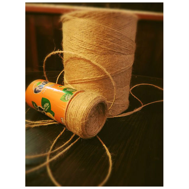 Selecione algumas latinhas de alumínio e forre-as com corda fina de sisal.
