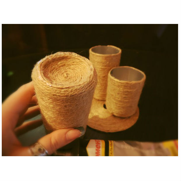 Quando todos os materiais estiverem revestidos com a corda de sisal, cole as latinhas de alumínio sobre o CD.