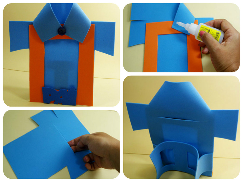 Corte um retângulo em uma cor de EVA. Neste retângulo, pelo sentido do comprimento, corte as laterais, mas deixando uma sobra, para ser a manga da camisa e faça um corte reto na parte superior, para ser o colarinho. Cole um retângulo em outra cor de EVA, para colocar a foto. Dobre e cole a tira superior formando o colarinho e cole o botão na junção das pontas. Faça um corte na parte detrás, para passar a foto e cole o suporte que vai manter o porta-retrato de pé. Se quiser cole uma palavra.