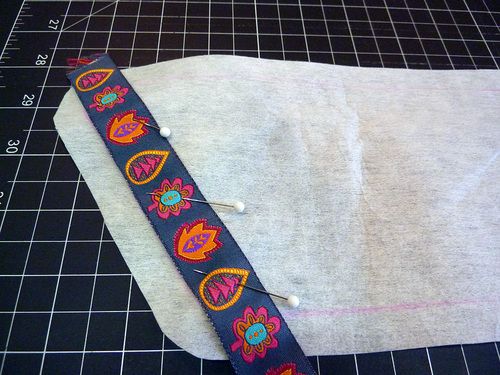 Em seguida, comece a posicionar os pedaços das fitas escolhidas sobre a parte com entretela.