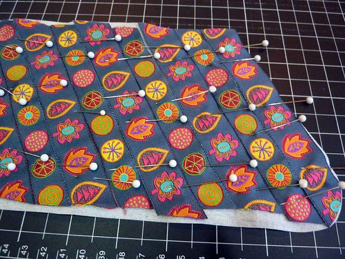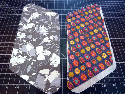 Agora, posicione a parte do forro com entretela sobre outra parte de tecido, com os lados do direito dos tecidos juntos, para dentro, e costure ao redor, mas deixando uma abertura. Depois vire a peça para o lado do direito do tecido.