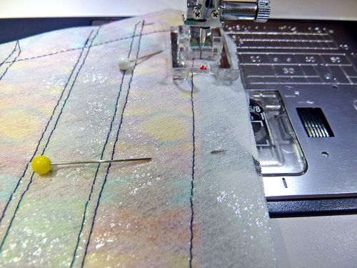 Logo após, costure uma parte de entretela na parte do avesso da parte de tecido.