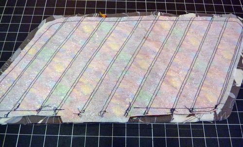 Agora, costure todos os pedaços de fita sobre a entretela, costurando dos dois lados dos pedaços de fita.