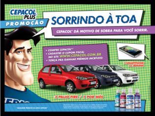 A Promoção Sorrindo à Toa, da Cepacol, está premiando os consumidores da marca com 12 iPhones 4S, de 16G e 3 automóveis Fiat, 0 km, modelo Palio Fire Economy 1.0 Flex, ano 2012, modelo 2013, 2 portas. O valor do carro bicombustível é de R$ 25.570,00.