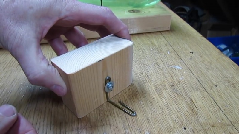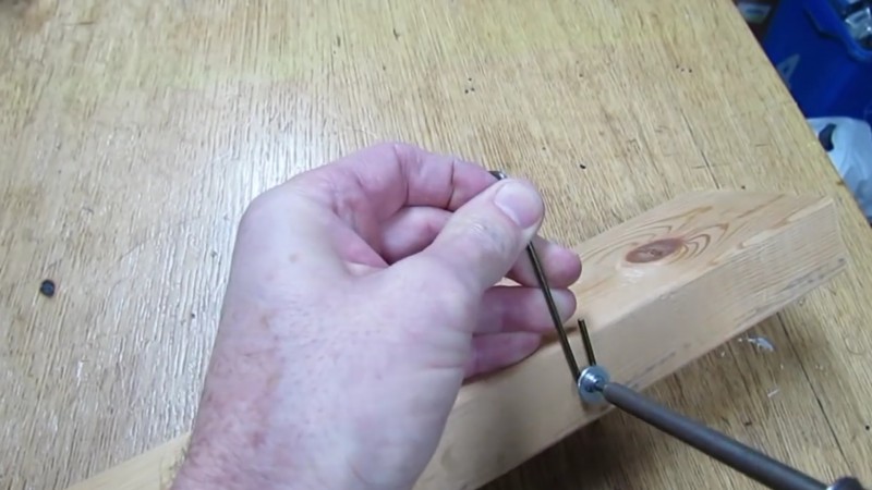 Prenda o pedaço maior de arame no pedaço maior de madeira, mantendo o arame entre a madeira e a arruela e com o parafuso deixando o arame se mexer um pouco.