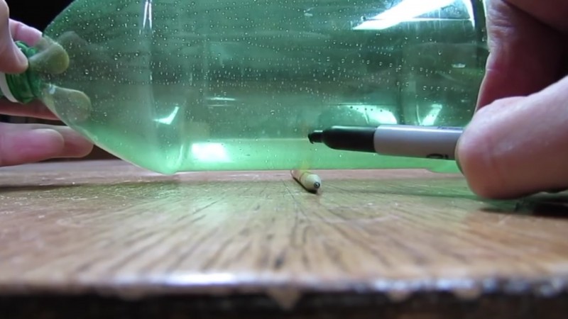 Coloque a garrafa sobre um lápis, para achar o ponto de equilíbrio e marque.
