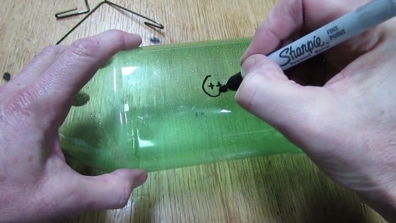 A 1,30 cm da primeira marcação, pelo sentido do bico da garrafa, faça outra marcação. E marque o outro lado da garrafa no mesmo rumo.