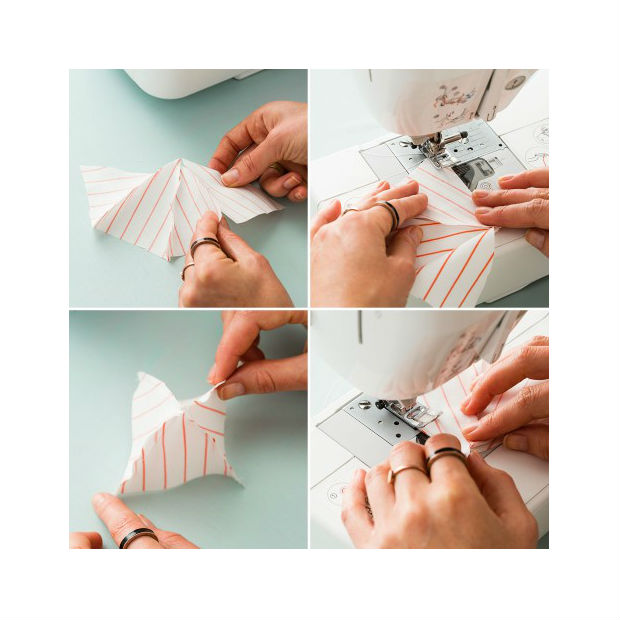 A seguir, costure os triângulos em cada extremidade, criando uma espécie de pirâmide.