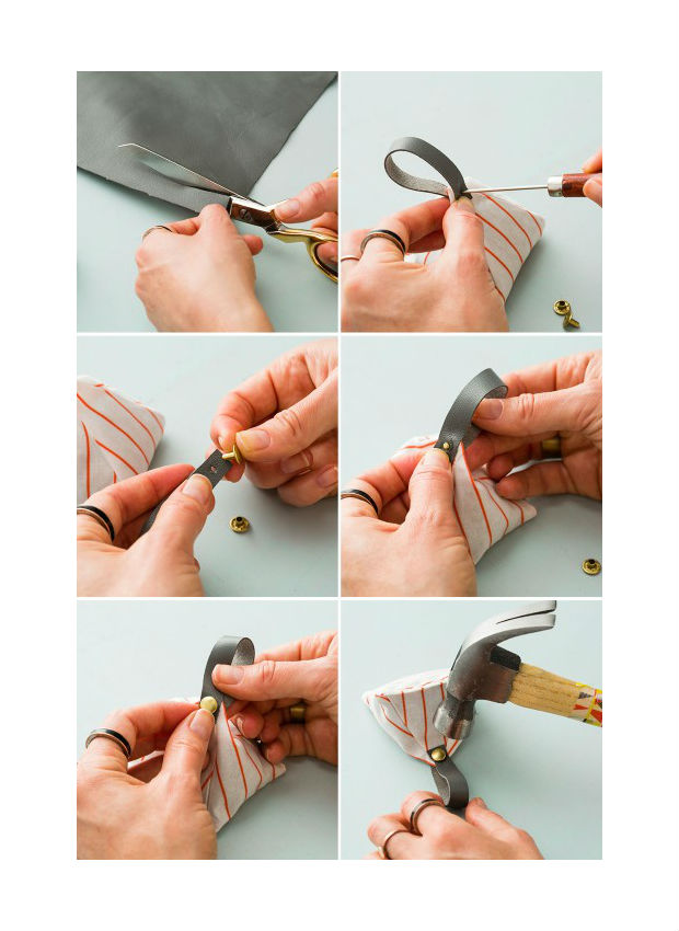 Corte uma tira de couro sintético e perfure-a com o furador.