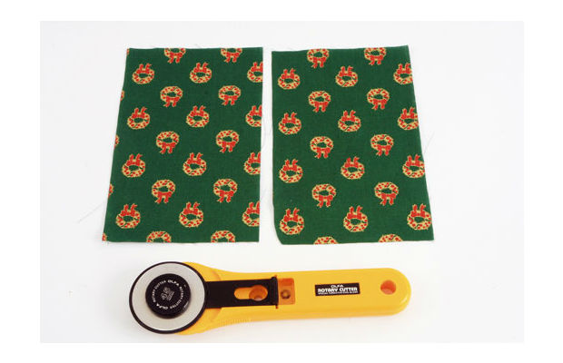 Utilize um cortador de base de corte e círculo para cortar uma tira de tecido verde, medindo 18cm de comprimento.
