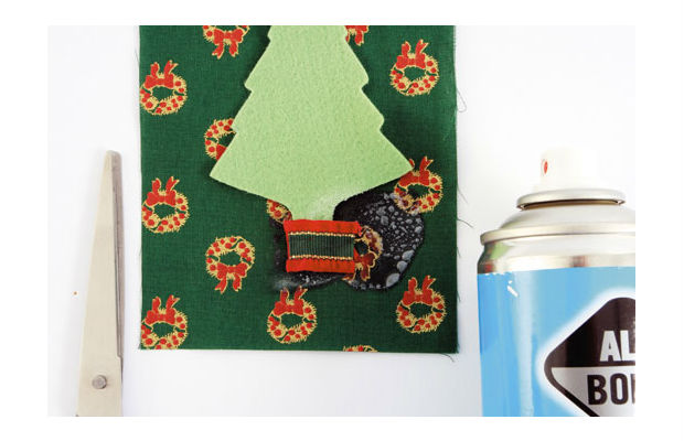 Transfira o desenho da árvore para um feltro, recorte e utilize adesivo de pulverização, colocando aplicações de suporte de um dos pedaços de tecido, em primeiro lugar, a árvore de colagem sentida.