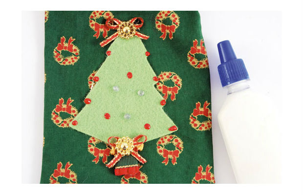 Recorte também um pedaço de fita estampada com motivos natalinos e cole na base da árvore de feltro, para fazer uma base para isto.
