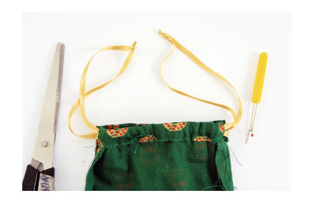 Recorte dois pedaços d ½ metro de fita dourada para anexar ao saquinho, unindo-as com um nó.