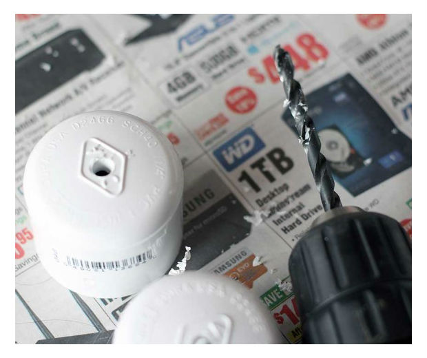 Faça um furo no topo das tampas dos tubos de PVC.