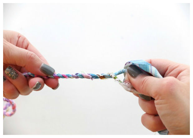 Trance os retalhos de tecidos que você tem, como na imagem acima, formando um cordão.