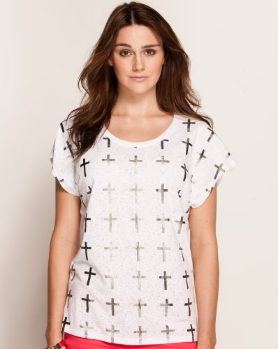 Todas as peças de roupas e acessórios são encontradas na versão com cruz, e a cruz pode estar localizada sozinha (e ser bem grande) em camisetas e vestidos ou ser uma estampa bem miudinha que de longe nem podemos definir se é uma cruz mesmo ou não.