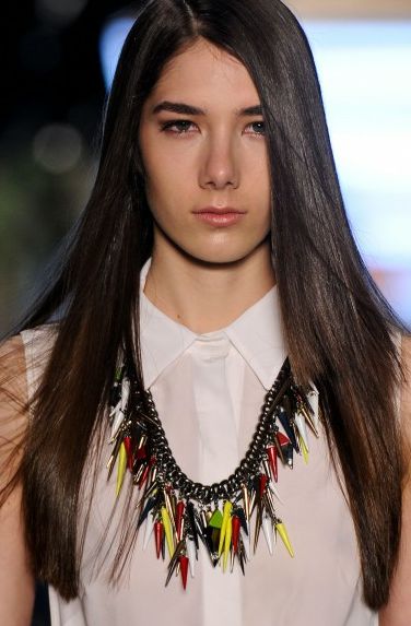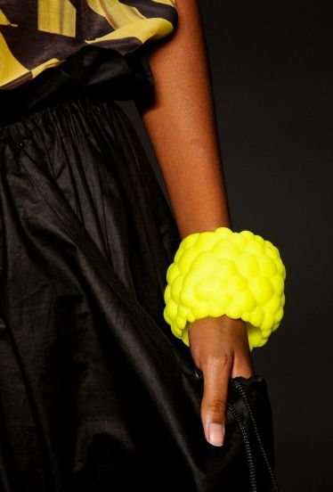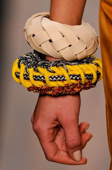 E no quesito bijoux, os brincos, anéis, colares e pulseiras continuam em tamanho máxi, com peças gigantescas, e muitas vezes usadas juntas, como nos conjuntos de maxicolar e maxibrincos ou no uso de diversas pulseiras ao mesmo tempo. Mix de materiais (principalmente entre o acrílico e os metais mais nobres), pedrarias imensas e coloridas, gargantilhas largas, e texturas, também estarão presentes nos acessórios verão 2013. (Leia também sobre Como Escolher o Decote Certo).