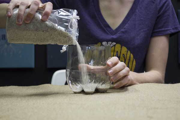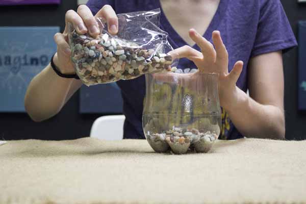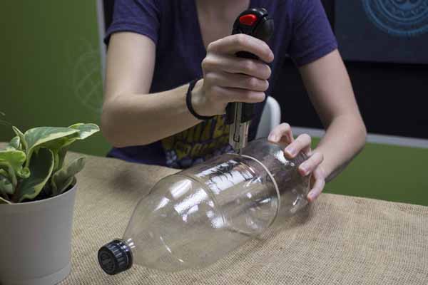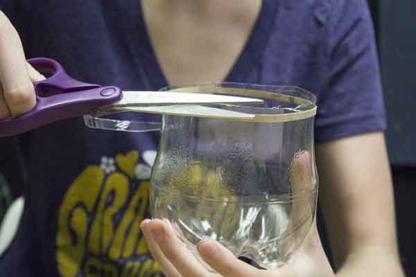 Comece separando todos os materiais que você vai utilizar no processo de como fazer terrário com suculentas. Posicione o elástico na parte da garrafa que vai cortar.