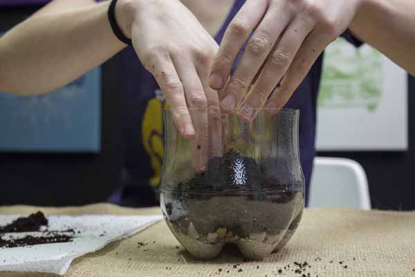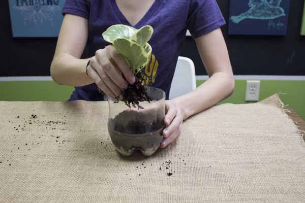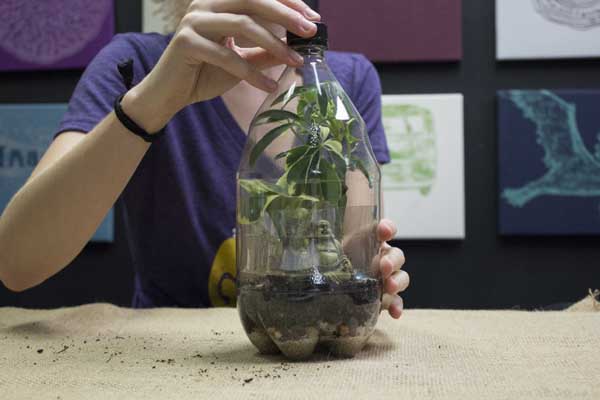Fure a parte superior, para as plantas respirarem, e encaixe no fundo.