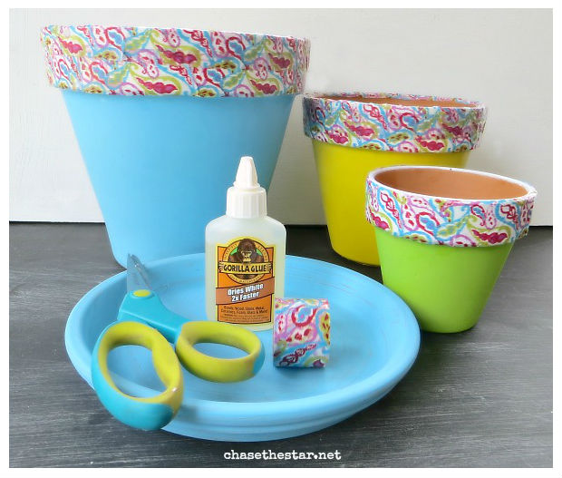 Aplique fita adesiva colorida e/ou estampada sobre essa borda, para dar um toque especial aos seus vasos.