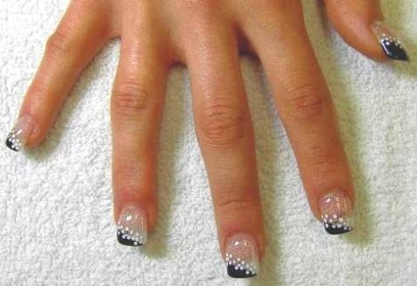 Comece fazendo sua unha normalmente, retirando as cutículas, lixando a unha com o formato desejado e passando uma fina camada de base. Em seguida, com um esmalte preto, faça a francesinha normalmente, usando o próprio pincel do vidrinho do esmalte, ou colocando sobre a unha um pedaço de fita adesiva (mas, deixando a ponta sem fita) no formato da francesinha que você quer (curvada ou mais reta), e passando o esmalte somente na ponta da unha, depois a fita.