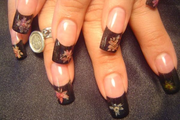 A seguir mais algumas ideias e modelos de decoração de unhas com unha francesinha preta com flor. (Leia também sobre Unhas Decoradas Simples e Fáceis de Fazer).