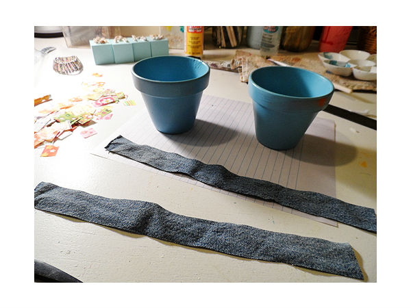 Agora, recorte uma tira de jeans ou de denim conforme a largura da borda do seu vaso e reserve-a.