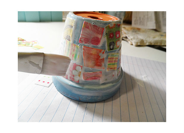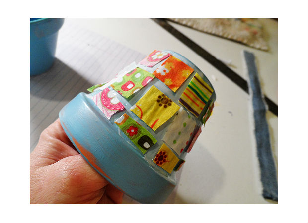 Cole os retalhos de tecido sobre o seu vaso, como na imagem acima.