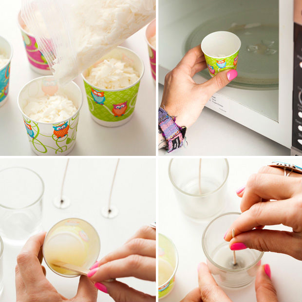 Ao retirar o copo descartável, mexa a cera derretida com um palito de picolé.