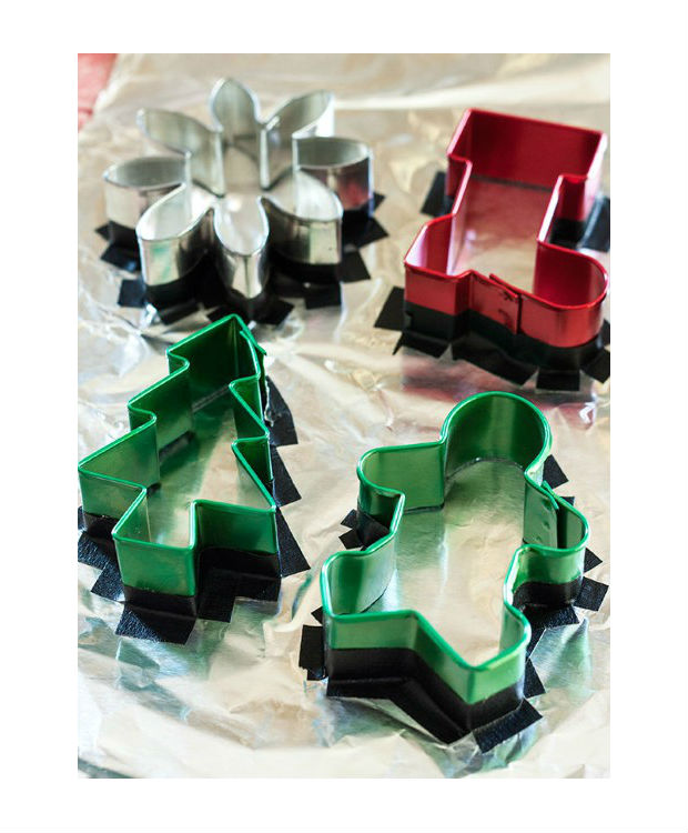Primeiro, prenda os cortadores de biscoitos natalinos com uma fita adesiva sobre uma folha de papel alumínio.